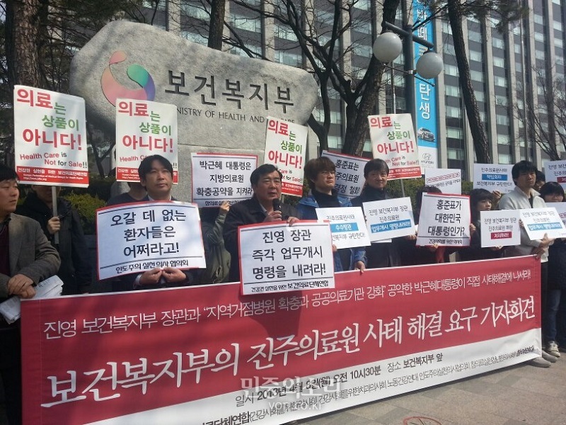우리는 진주의료원 사태에 대한 보건복지부의 책임 있는 해결을 요구하기 위해 이 자리에 모였다. 진주의료원은 국가와 지방자치단체가 서민들이 인간으로서 누려야 할 생명과 건강권을 보장하여야 할 책임을 이행하기 위하여 설립한 비영리 공공의료기관이자 지역거점병원이다. 진주의료원이 서민들의 건강권을 보장하기 위한 공공보건의료사업을 수행하면서 운영 적자가 발생하는 것은 필연적인 것이며, 병원운영에서 이익을 남기는 것이 오히려 잘못된 것이다.