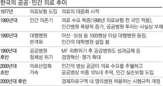이 기간 공공병원은 찬밥 신세였다. 서울대 이진석 교수는 ‘공공의료의 현황과 비전’ 자료에서 “공공병상 확충은 민간병원을 통해서도 병상 확충이 어려운 지역이나 시장성이 열악해 민간 참여가 어려운 영역(결핵·정신병원)에 국한해 이뤄졌다”고 밝혔다. 그 결과 민간병원은 넘쳐나지만 공공병원은 찾아보기 힘든 지금의 구조가 만들어졌다.