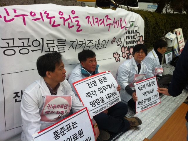 우리 보건의료인들은 오늘 단식농성에 들어갑니다. 우리는 의료인으로서 투쟁 방법으로 단식을 권고하지 않고 있습니다. 그럼에도 불구하고 의료인으로서 단식농성에 돌입하는 이유는 진주의료원 폐쇄는 너무도 절박한 문제이기 때문입니다. 재정적자를 핑계로 공립병원을 폐쇄하면 한국에서 살아남을 공립병원들은 없습니다.