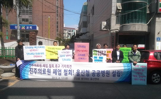 ‘건강을 생각하는 울산연대’는 12일 오후 2시 남구 달동 새누리당 울산시당 앞에서 기자회견을 열고 ‘새누리당 홍준표 경남도지사는 5월 2일까지 예고된 강제 휴업 조치를 즉각 중단하고, 폐업 방침을 철회할 것’ ‘보건복지부는 의료법이 정한 바에 따라 즉시 경남도에 휴·폐업 철회명령을 내릴 것’ ‘새누리당과 박근혜 정부는 보건의료정책 공약을 지키고 공공의료 강화 방안을 마련할 것’ 등을 요구했다.