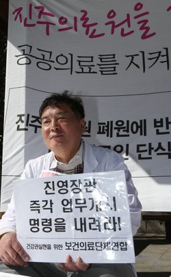 | ▲ 우석균 정책실장 등 보건의료단체연합 회원들은 진주의료원 폐업 철회를 촉구하며 보건복지부 앞에서 15일로 6일째 단식 농성을 하고 있다. ⓒ보건의료단체연합 |