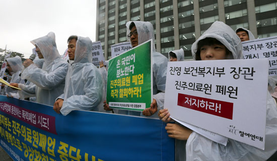 - 경남도가 진주의료원 폐업을 발표한 29일 오전 서울 계동 보건복지부 앞에서 의료시민단체 회원들이 기자회견을 열어 진주의료원 폐업의 즉각 중단을 촉구하고 있다. 연합뉴스