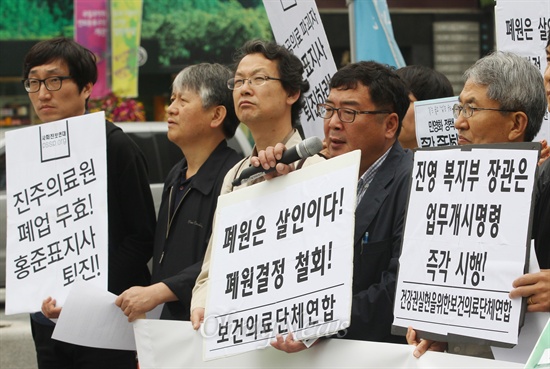 | ▲ “진주의료원 폐업 철회하라” 경상남도가 진주의료원 폐업 방침을 발표한 29일 오후 서울 종로구 광화문광장 이순신동상 앞에서 진주의료원 지키기 공공의료강화 범국민대책위원회 소속 회원들이 기자회견을 열어 진주의료원 폐업 철회와 홍준표 경남도지사의 퇴진을 촉구하고 있다. | |