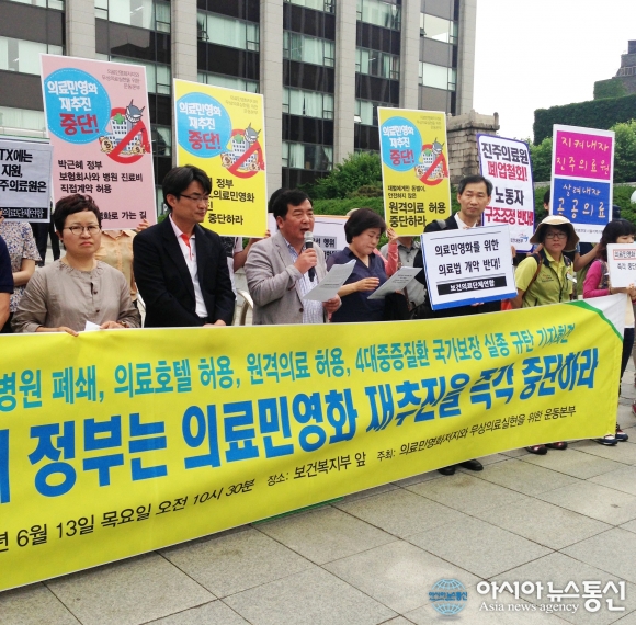 우리는 모든 의료민영화 시도에 반대하며 국민들의 반대에도 불구하고 이명박 정부시기의 의료민영화 정책을 재추진하는 박근혜 정부를 규탄한다. 민영화 재추진, 복지공약 전면 후퇴 시도를 박근혜 정부가 계속한다면 거대한 국민적 저항에 직면할 것임을 박근혜 정부는 명심하여야 한다.