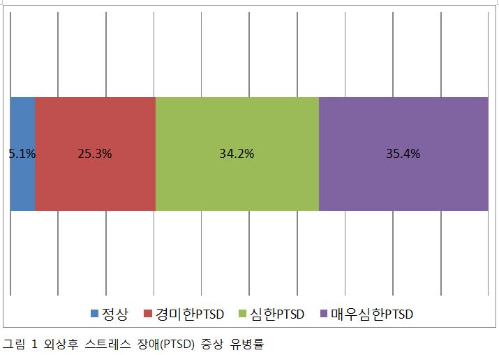 가. 조사 대상자 중 매우 심한 외상후 스트레스 장애 증상을 보이는 이들은 35.4%에 달하였다. 이는 일반 인구에 비해 4-5배, 전쟁 및 내전을 겪은 이들에 비해서도 더 높은 수치이다. 9.11 사태를 겪은 미국 시민들에 비해 2.4배, 걸프전에 참전한 미군에 맞먹는 증상 유병률이다. 또한 쌍용자동차 해고노동자보다도 높은 수준이다.