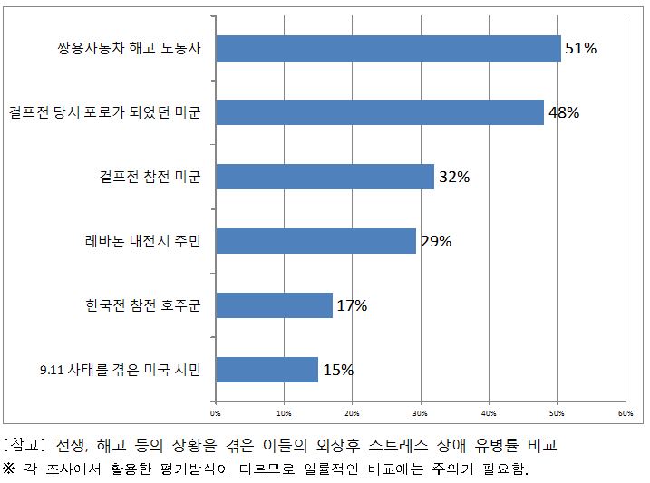 - 일반 인구에 비해 4-5배, 전쟁 및 내전 상황을 겪은 이들보다 더 높은 정신심리적 외상 비율 보여-