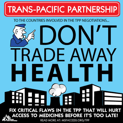 전세계 수십억 민중이 생명을 살리는 의약품에 접근하지 못합니다. 이것은 여러 가지 원인이 복합적으로 작용한 것이지만 하나의 핵심적인 요인은 터무니없이 높은 특허-독점화된 의약품 가격입니다. 현재 협상되고 있는 TPP 조항들은 이 상황을 악화시킬 위험성이 있으며 이것은 많은 사람들에게 삶과 죽음의 문제입니다.