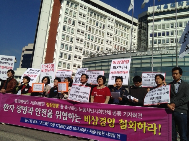 한국의 병상당 간호인력은 OECD 평균의 1/4에 불과할 정도로 인력부족현상이 심각하다. (OECD 평균 간호사당 병상수 0.5 한국 1.9) 이 때문에 환자들은 적절한 의료서비스를 제공받지 못하고 병원노동자들은 장시간 강도 높은 노동에 시달린다. 서울대병원이 해야 할 일은 인력충원과 비정규직 정규직 전환이지 비상경영으로 환자와 노동자들을 더욱 쥐어짜는 일이 아니다.