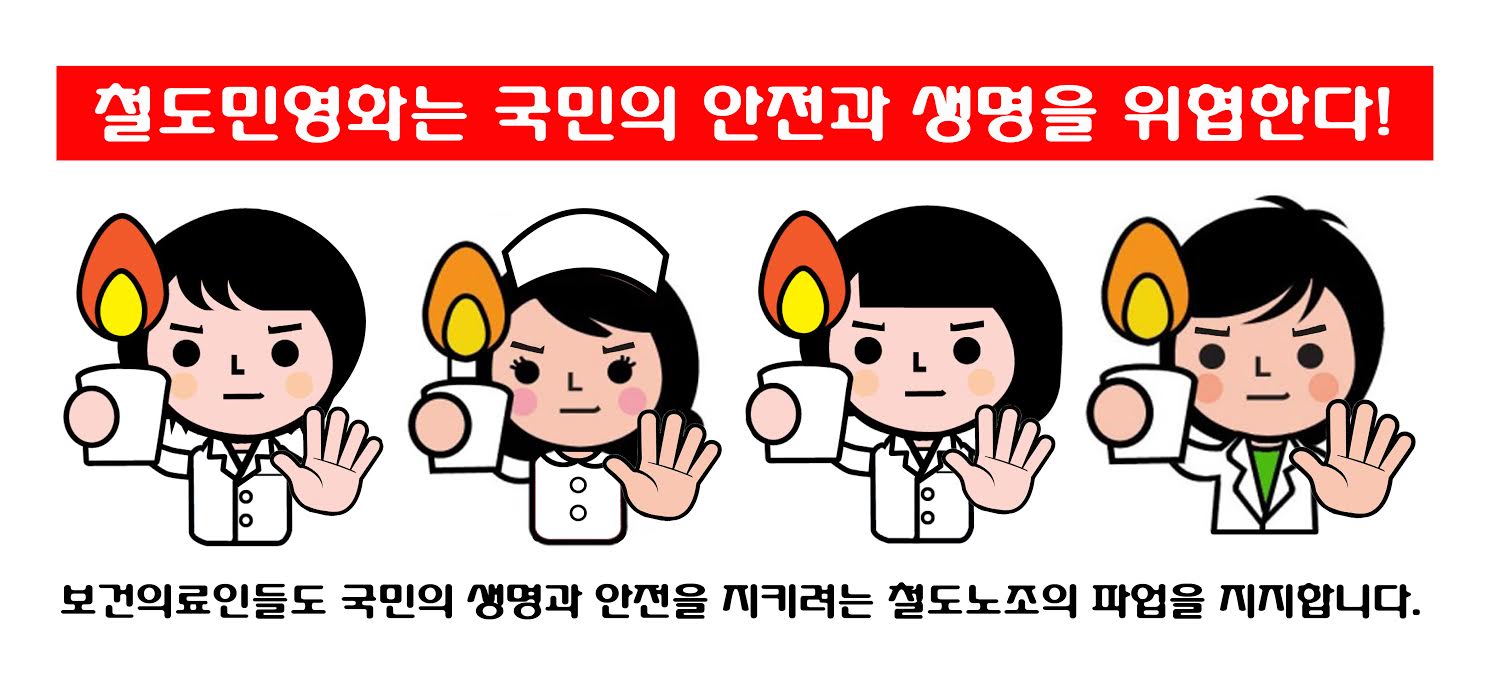 우리 보건의료인들은 박근혜 정부가 불법적으로 진행한 이사회의 결정을 철회하고 철도 민영화 계획을 전면 백지화할 것을 촉구한다. 그리고 합법적으로 진행되는 철도노조에 대한 탄압 또한 중단해야 한다. 철도민영화는 국민들의 민생과 복지는 물론 국민들의 생명을 위협한다. 철도노조의 파업은 국민들의 생명을 위한 파업이다. 따라서 우리 보건의료인들은 철도노동자들의 파업이 정당하며 이를 지지함을 분명히 밝힌다.