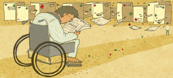 #골절 수술을 하고 퇴원한 김씨가 집에 도착하니 의료비 청구서가 날라왔다. 이미 지불한 입원비용 말고도 마지막에 쓴 비용이란다. 관절보호용구 500만원, 특수신발 200만원, 특수목발 100만원, 특수물리치료 및 수치료 예약비 300만원…. 김씨는 이제 고민하기 시작한다. 수술 후 치료를 위해 계속 병원 외래치료를 받아야만 할까, 아니면 그냥 뼈가 저절로 굳도록 기다리고 집에서 나 혼자 소독하고 드레싱하면서 버틸까, 에이 다리 한쪽 조금 절룩거리는 게 뭐 큰 불편이겠나, 치료비 때문에 온갖 생각이 다 든다. 그래, 약국에서 소독약과 거즈를 사서 집에서 소독하고 운동하며 재활을 하는 거다! 서민들이 한다는 일명 자가치료법! 인터넷에 오만 가지 노하우가 떠 있다. 이가 없으면 잇몸으로 살랬다고, 김씨는 약국으로 간다.