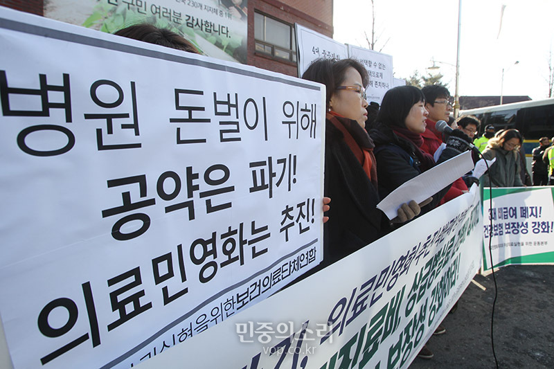 박근혜 정부가 국민들의 절박함은 아랑곳없이 오로지 재벌과 대형병원만을 위한 정책을 계속 추진한다면, 정권의 퇴출만이 국민들의 건강을 위한 것임을 주장할 수밖에 없다. 우리는 의료민영화 저지와 3대 비급여문제의 완전한 해결, 4대 중증질환을 포함한 건강보험 보장성 확대를 위해 끝까지 싸울 것임을 밝혀둔다.<끝>