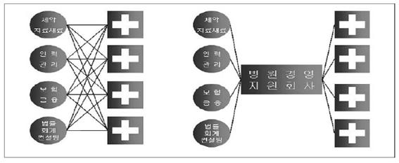 - 이 보고서는 특히 MSO의 유형을 경영지원형 MSO와 자본조달형 MSO로 나누고 있음. 우선 “경영지원형 MSO의 경우 구매대행, 의료시설 등 자원공유, 인력관리, 마케팅, 법률 회계등 경영영활동의 아웃소싱과 진료연계를 통해 네트워크 병원들의 경쟁력 방화를 추구”하는 MSO로 정의하고 있는데 이는 2010년 정부가 의료법 개정안에서 추진하고 있는 병원경영지원사업의 내용이었음. 이는 다음 그림과 같음.