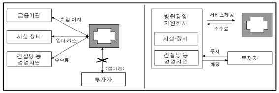 - 2006년 12월 당시 재경부는 <서비스산업 경쟁력강화 종합대책>을 발표했음당시 재경부는 “병원경영지원회사(이하 MSO) 활성화를 위한제도개선방향”이라는 보고서를 내고 의료서비스산업 고도화에 병원경영지원회사의 역할을 매우 중요한 것으로 밝혔음. 이 보고서에는 MSO의 모델을 다음과 같이 나누고 있음.