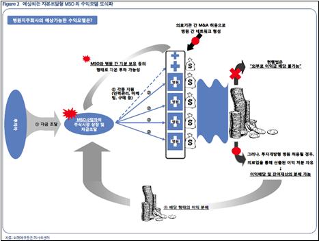 - 또 이보고서는 “현재 의료기관들의 수직적 수평적 계열화등이 진행되고 관광, 보험 등 여타산업과 의료산업이 연계되어 MSO가 설립되고 있어 비영리법인 병원의 수익사업이 확대되는 효과가 예상되며 MSO는 특히 채권발행, 주식시장상장 등을 통해 영리병원의 설립을 이끌어 낼 것“이라고 설명하고 있음.