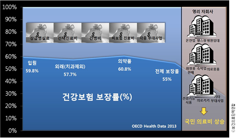 결국 건강보험은 있긴 있지만 재정악화로 보장성이 떨어지거나, 병원 자회사들이 만든 비급여 진료가 더 많아져 무늬만 있는 국민건강보험으로 남을 수 있습니다.