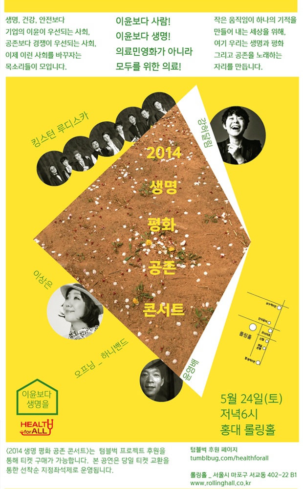 2014 생명 평화 공존 콘서트 이윤보다 생명은, 보다 인간다운 세상을 만들어 나가고자 하는 평범한 많은 사람들이 서로 만나, 서로를 보듬고 마음을 나누는 자리가 될 것입니다. 모든 이들의 건강권이 실현될 수 있는 세상을 위해 노력하고 있는 보건의료단체연합은 이번 콘서트를 시작으로 매해 더 많은 사람들이 건강과 생명의 소중함을 노래하고, 공존의 아름다움을 노래하는 자리를 만들 예정입니다. 음악으로 생명의 소중함을 노래하고, 모두를 위한 의료, 모두를 위한 건강, 이윤보다 생명을 노래하는 첫 자리에 글로 세상을 바꾸는 관심과 후원을 부탁드립니다.(끝)