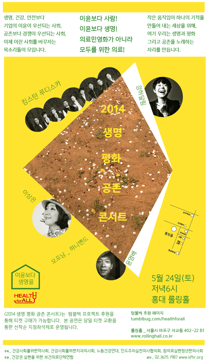 그리하여 ‘2014 생명 평화 공존 콘서트 -이윤보다 생명’이 의료민영화에 맞서고 이윤보다는 생명이라는 가치를 알리기 위해 열린다. 의료비 증가율이 세계 1위인 나라 대한민국. 지난 2년 동안 가난한 사람들이 아파도 병원에 못 가 끙끙 참아서 국민건강보험 재정이 1/5인 10조원이 남은 나라. 지난 9년간 자살률 1위. 산업재해로 죽는 노동자 1위를 달리는 나라 대한민국. 이런 나라의 기업과 정부가 만든 세월호 참사와 규제완화라는 재앙.