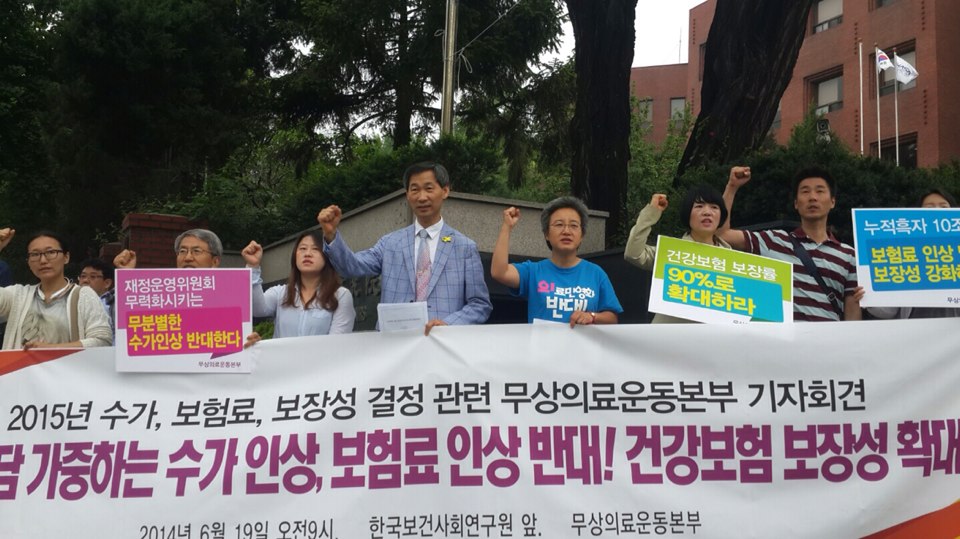 오늘 건강보험정책심의원회(이하 건정심)는 2015년 치과, 한방에 대한 건강보험 수가(환산지수), 보험료, 보장성 강화 계획을 심의·의결한다. 이는 건강보험의 재원조달과 재정의 쓰임새와 관련된 사안이다. 국민들의 적정한 보험료 부담과 의료비 부담 감소가 중요한 원칙이 되어야 하며, 이에 무상의료운동본부는 다음과 같이 입장을 밝히는 바이다.