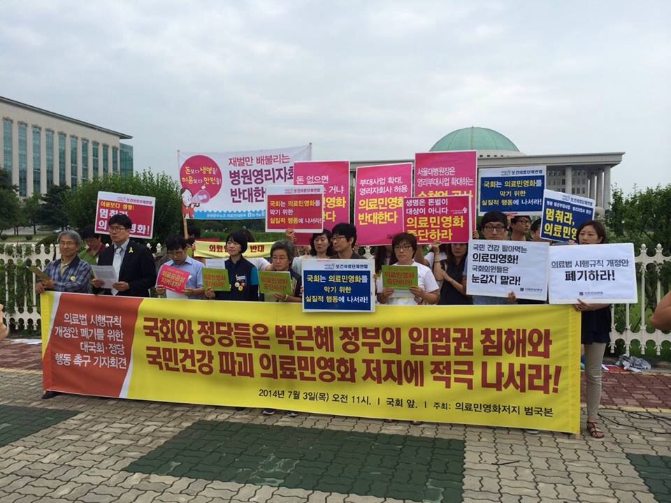 또 다른 심각한 문제는, 단 한 차례도 국민의 뜻을 묻는 절차를 거치지 않은 채 국회의 입법권까지 무시하면서까지 일방적으로 의료민영화 정책이 추진되어 왔다는 점이다. 게다가 정부가 발표한 의료법 시행규칙 개정안과 영리자회사 가이드라인은 “의료기관은 영리행위를 할 수 없다”고 규정하고 있는 의료법을 위반하고 있다. 박근혜 정부는 국민의 뜻을 무시했고, 행정부는 스스로 법을 어기면서까지 의료민영화를 밀어붙이고 있다.