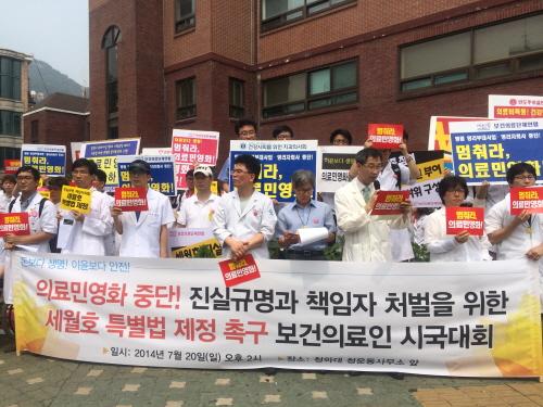 이날 시국대회에는 건강권실현을위한보건의료단체연합과 세월호유가족대책위원회, 전국보건의료산업노동조합, 공공운수노조 의료연대본부, 민주화를위한교수협의회, 민변 공공성강화위원회, 건강사회를위한치과의사회·약사회, 인도주의실천의사협의회 등이 참여했다.