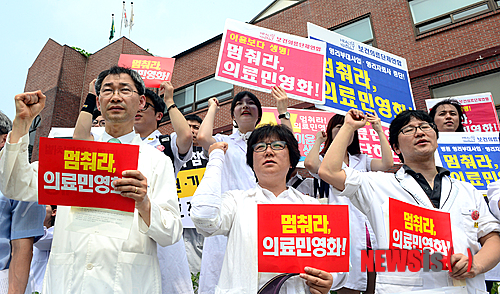 건강권 실현을 위한 보건의료단체연합은 이날 오후 서울 종로구 청운동사무소 앞에서 ‘의료민영화 중단과 세월호 특별법 제정 촉구 보건의료인 시국대회’ 기자회견을 열고 “박 정부는 오는 22일 의료민영화법 입법예고 기간이 끝난 뒤 시행을 강행하려고 한다”며 이같이 주장했다.