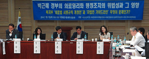 민주사회를위한변호사모임 정소홍 변호사는 “입법예고된 의료법시행규칙 개정안을 보면 의료법에서 너무 벗어나 있다”면서 “건물임대업만 놓고봐도 병원 수익에는 도움될 수 있겠지만 환자와 종사자 편의와 무슨 관련있는 지 모르겠다”고 지적했다. 정 변호사는 또 “건강기능식품은 강매위험있으니까 안되고 식품은 된다는 것도 말이 안된다. 법률적으로 보면 식품의 범위가 훨씬 광범위하다”고 말했다. 그는 “많은 이야기도 필요하지 않다. 헌법에서 정한 정부와 국회 간 권한의 배분문제, 하위법령이 입법권을 침해하는 그런 결과로 이어질 수 있다”면서 “전면 재검토해야 할 사안”이라고 주장했다. 그는 “법제처 심사 때 이 부분을 꼼꼼히 따져 의료법 입법취지에 맞는 해석이 내려져야 한다”고 주문했다. 지정토론자들의 우려도 다르지 않았다. 보건의료노조 나영명 정책실장은 “이 문제로 5일 뒤에 파업을 예고하고 있다”면서 “정부는 병원이 정상적인 진료만으로 운영이 가능하도록 잘못된 제도가 있으면 바로 잡아야 하는 데 본업이 아닌 다른 방식으로 수익을 창출하게 해 상황을 더욱 왜곡시키려 하고 있다”고 비판했다. 나 정책실장은 “이번 정책은 의료법인의 비영리성을 근간으로 하는 우리나라 현행 의료체계를 근본적으로 뒤흔들 수 있다”면서 “국민의 건강과 생명을 보호하기 위해 복지부가 앞장서서 막아야 할 사안”이라고 주문했다. 의료연대본부 이향춘 서울지부장은 “병원이 최선의 치료를 제공하지 않고 대신 최대한의 검사와 치료를 통해 수익을 내고 쇼핑몰까지 만들어 환자들의 호주머니에 남은 돈까지 털어내도록 정부가 적극 권장하고 있다”고 비난했다. 이 지부장은 특히 논란이 되고 있는 서울대병원 영리자회사 헬스커넥트를 언급하면서 “서울대병원이 이 회사를 설립해 영리를 추구하는 것은 의료법 위반이다. 의료가 돈벌이로 전락하는 의료법시행규칙은 철회돼야 한다”고 촉구했다.