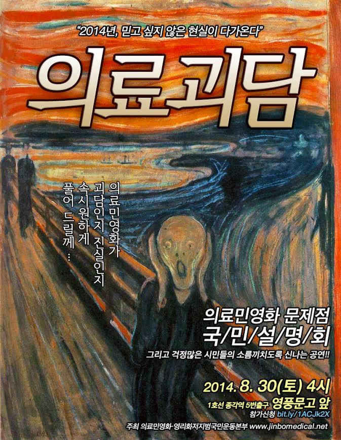 1. 의료민영화·의료영리화 저지와 의료공공성 강화를 위한 범국민운동본부(이하 “의료민영화저지범국본”)는 8월 30일(토) 오후 4시 영풍문고 앞 (청계천 방향)에서 ‘의료괴담’에 대한 진실을 알리는 국민설명회 “의료괴담?!”를 개최합니다.