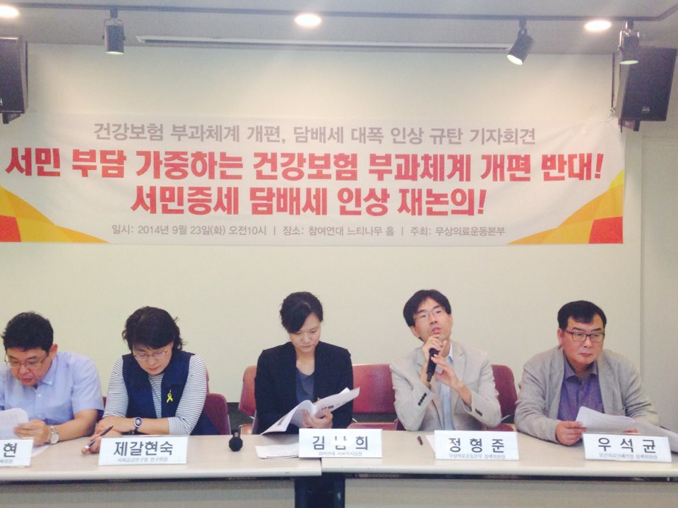 일시 및 장소 : 2014년 9월 23일(화) 오전 10시. 참여연대 느티나무 홀[1부 기자회견]□ 사회 : 김재헌 무상의료운동본부 사무국장 □ 진행순서 1. 여는 말: 김경자 무상의료운동본부 공동집행위원장(민주노총 부위원장) 2. 발언 - 우석균 보건의료단체연합 정책위원장 - 연대 규탄 발언: 강동진 빈곤사회연대 집행위원장 3. 기자회견문 낭독 [2부 기자설명회]□ 사회: 김남희 참여연대 사회복지팀장 (변호사) □ 참여자 : - 우석균 보건의료단체연합 정책위원장 (의사) - 제갈현숙 사회공공연구원 연구위원 (사회학 박사) - 정형준 무상의료운동본부 정책위원장 (인도주의실천의사협의회 정책국장) - 김준현 건강세상네트워크 정책위원 |