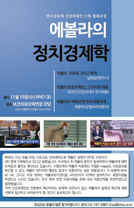 연구공동체 건강과대안에서는 최근 전 세계에 도전이 되고 있는 에볼라에 대한 정치경제학적 의미를 살펴보는 토론회를 개최합니다. ”에볼라의 정치경제학” 이라는 제목으로 열리는 건강과대안 공개포럼은 전염병의 유행이라는 관점을 넘어, 에볼라의 발병과 확산 그리고 국제 보건의료의 대응과 도전에 대한 숨겨진 문제들을 짚어보고자 합니다. 아래 글은 발제를 맡은 최규진 연구위원의 기고글입니다. 관심있는 분들의 참여를 바랍니다.