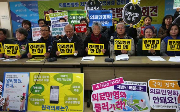 박근혜 정부의 일방적이고 독단적인 의료민영화 강행 정책으로 한국 의료는 매우 커다란 위기를 맞고 있다. 이미 영리자회사를 허용하여 의료의 비영리성을 최초로 허물어버린 이 정부는 병원 간 인수합병도 허용하고 경제자유구역 영리병원도 허용하여 전국의 병원을 투기자본의 놀이터로 만들려 한다. 또한 줄기세포, 유전자치료에 대한 임상시험을 완화하고 신의료기술 평가 과정도 대폭 생략해 온 국민을 임상시험 대상으로 만들려 한다. 더욱이 국민 개인질병정보 유출 위험이 있는 원격의료도 끝내 강행하겠다는 의지를 보이고 있다. 최근 보험사들과 기업들이 요구하고 있는 보험사의 병원 유인 알선 행위까지 허용된다면 공공병원의 존재가 미국보다도 낮은 한국은 미국보다 더욱 심각한 의료 후진국으로 전락할 수 있다.