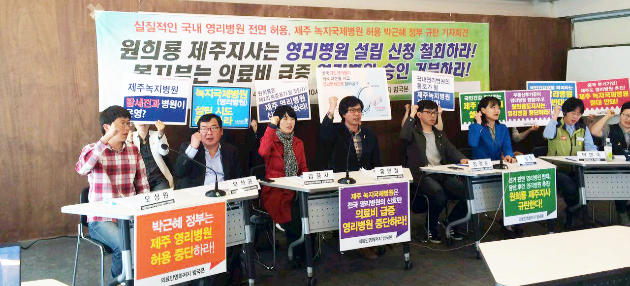 의료민영화저지범국민운동본부는 제주도민과 함께 국내 영리병원 1호를 설립하려는 제주 녹지병원 설립을 막아낼 것이다. 원희룡 제주도지사는 ‘제 2의 홍준표’ 라는 오명을 얻지 않으려면 지금 당장 제주 영리병원 설립 신청서를 철회하고 BK성형외과와 서울리거 병원의 관계와 녹지병원 실질 운영 주체에 대한 모든 사실을 낱낱이 밝히고 해명해야 한다. (끝)