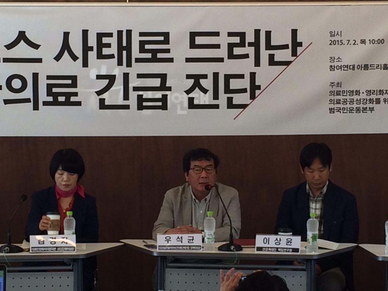 2. 김경자(의료민영화저지범국본 상임집행위원장)의 사회로 진행된 이날 토론회에서는 우석균 (건강권실현을위한 보건의료단체연합 정책위원장)과 나영명(전국보건의료산업노동조합 정책실장)이 발제자로 나서, ‘메르스 사태와 한국 의료의 문제점’을 지적하고 그에 대한 시민사회단체의 요구안을 제시했다. 우석균 정책위원은 메르스 감염이 메르스 사태에 이르게 된 경위를 설명하고, 1) 박대통령이 사태를 책임질 것과 진상규명 요구 2) 지역거점 병원 강화 등 공공의료강화에 대한 정부대책 요구 3) 병원 감염을 확산시킬 영리병원 등 의료민영화 정책 중단 요구 4) 쇼핑몰, 수영장 등 병원 내 부대사업 확대 조치 철회등 병원감염방지를 요구했다. 나영병 정책실장은 1) 메르스 확산은 공공의로 취약성과영리추구 중심의 보건의료체계가 초래한 최악의 결과물임이며, 공공의료 설 장비 인력인프라가 너무나 취약다는 점을 지적 2) 공공의료 확충을 중심으로 국가방역시스템과 왜곡된 보건의료체계를 개선하는 국가플랜을 요구 3) 정부, 정당, 전문가, 보건의료단체, 시민사회단체가 망라된 사회적 논의기구를 만들자고 주장했다.