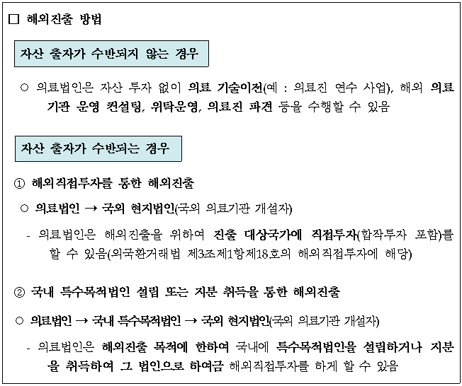 현행법상 의료법인의 해외 투자는 그 법적 근거가 명시되어 있지 않다. 따라서 의료법인들은 해외진출 가능 여부 및 그 절차를 명확하게 규정해 달라는 요구를 해왔고 지난 해 7월 정부가 ‘의료법인 해외진출 안내서’(가이드라인)를 배포하면서 그 행정적 근거를 마련하였다. 바로 의료법인의 해외진출을 위한 ‘영리자회사’ 가이드라인이다.