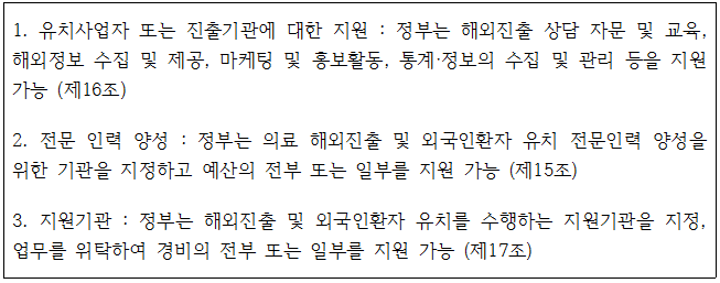 그림8. [의료 해외진출 및 외국인환자 유치 지원에 관한 법률안] 정리 – 의료관광·해외진출 기관에 대한 국가 지원