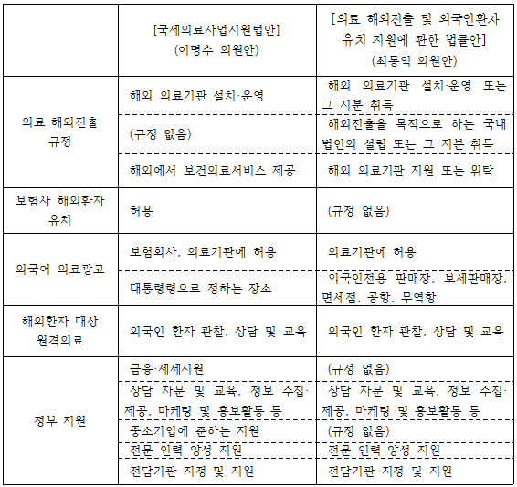 - ‘국제의료사업지원법안’ 및 ‘의료 해외진출 및 외국인환자 유치 지원에 관한 법률안’ 의 주요내용과 문제점