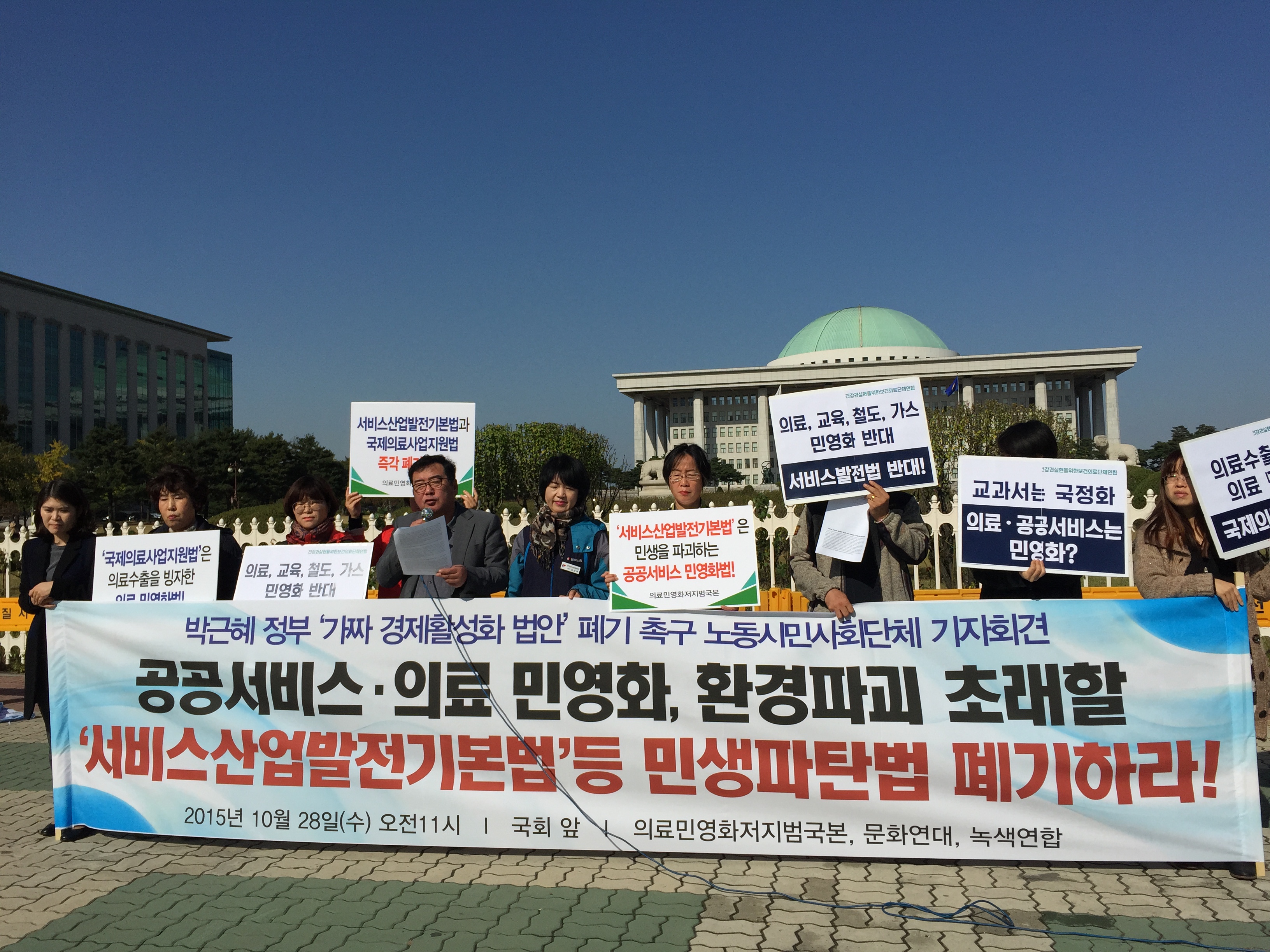 어제(27일) 박근혜 대통령은 시정연설을 통해 ‘경제활성화 법안’들이 수년 째 국회에 계류되어 있다며, ‘서비스산업발전기본법’, ‘관광진흥법’, ‘국제의료사업지원법’, ‘의료법’의 조속한 처리를 주문했다. 박근혜 대통령은 이 법안들이 “경제에 활력을 불어넣고, 청년들에게 일자리를 주기 위한” 것이라고 강조했다. 그러나 이 법안들은 민영화와 규제완화를 통해 어려운 민생을 더욱 옥죄고 힘들게 만들 법안이다. 또한 청년 일자리 운운하지만 민영화와 규제완화로 일자리를 줄이고 불안정한 비정규직 일자리를 늘릴 정책들이다.