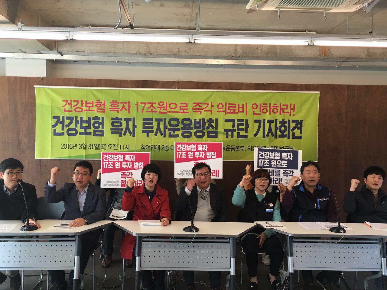 특히 건강보험에 대해서 자산운용 결과를 설명하며, ‘단기간에 적립금이 크게 늘어나고 있는 기관’으로 묘사하고, ‘해외, 대체 투자’등을 추진하겠다는 뜻을 밝혔다. 또한 개념상 존재하지도 않는 건강보험의 투자 수익률 같은 개념을 밝히며, 여타 사회보험 중 가장 수익률이 낮다(2.2%)고 밝히기도 했다. 국민건강보험의 기본 원리와 근간을 송두리째 포기하는 이 같은 계획에 우리는 분노하며 다음을 밝힌다.