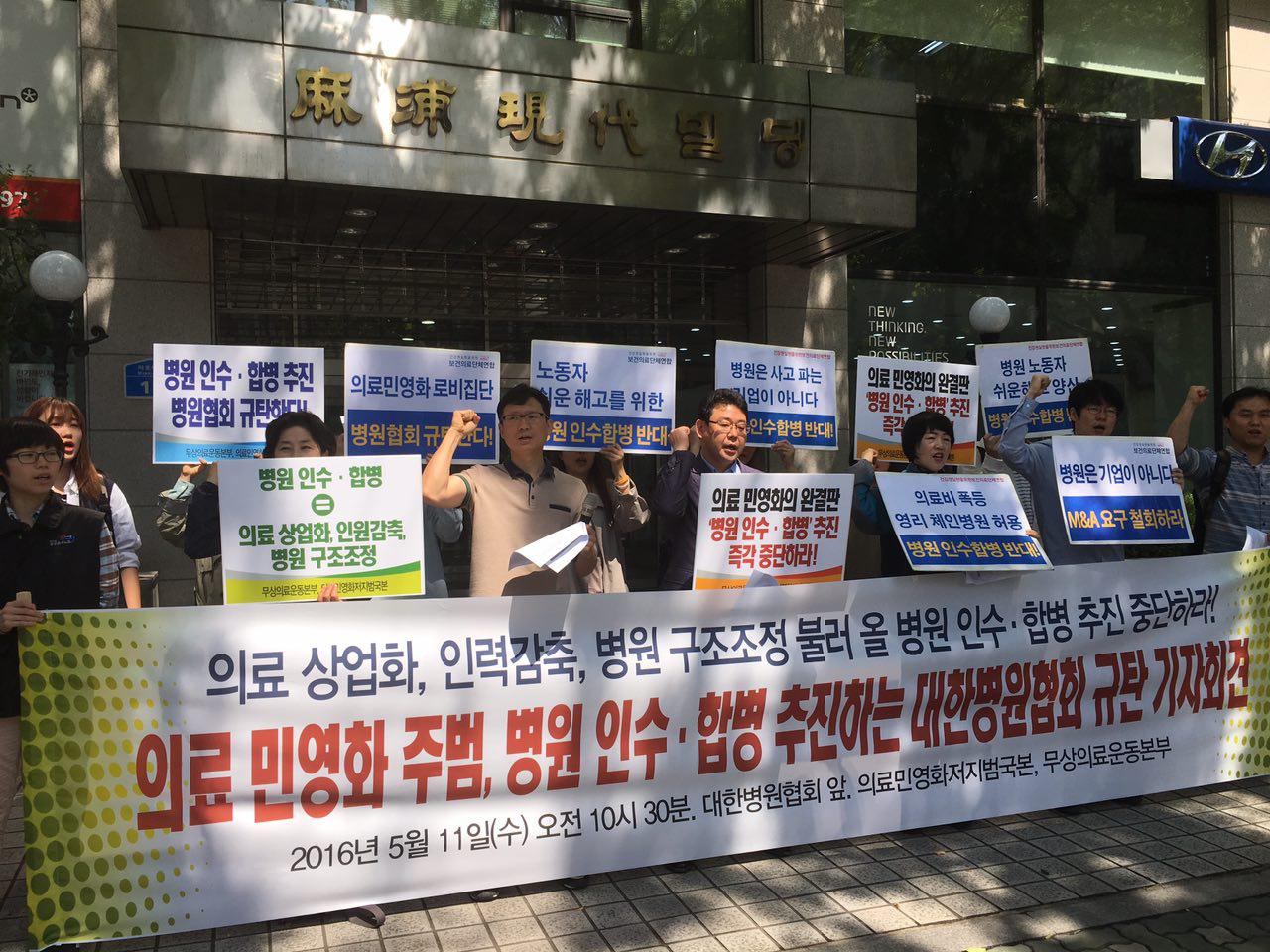 그러나 이제 대한병원협회가 그런 양심적인 의료인 및 사회사업가들을 완전히 배신하고 뼛속까지 국민들을 돈벌이 수단으로만 보며 구조조정을 위한 칼자루를 휘두르는 행태를 더는 보고 있지 않을 것이다. 우리는 돈이 없으면 병원 근처도 가지 못하는 미국의 모습을 맹목적으로 추종하는 시대착오적이고 탐욕적인 병원협회에 맞서, 시민들의 건강권, 병원 노동자들의 일자리, 그리고 한국의료의 공공성을 지키기 위해 함께 싸울 것이다. 병원협회는 병원을 사고파는 상품으로 만드는 병원 인수합병 추진을 중단하라. 박근혜 정부는 병원협회의 이윤을 위한 병원 인수합병 허용 입법을 당장 멈춰라. (끝)