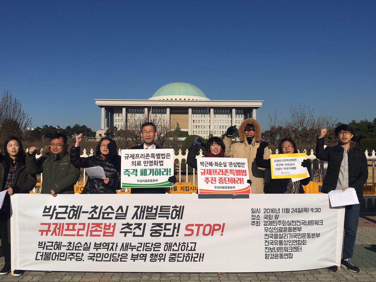 특히 이를 저지해야 마땅한 더불어민주당과 국민의당은 법안 통과에 다리를 놔주고 있다. 이에 우리 시민사회단체들은 박근혜-최순실-전경련의 국정농단에 부역하고 있는 새누리당과 이에 공조하고 있는 더불어민주당, 국민의당을 규탄하며, 국민의 삶과 안전을 위협하는 규제프리존법을 당장 폐기할 것을 촉구하는 바이다.