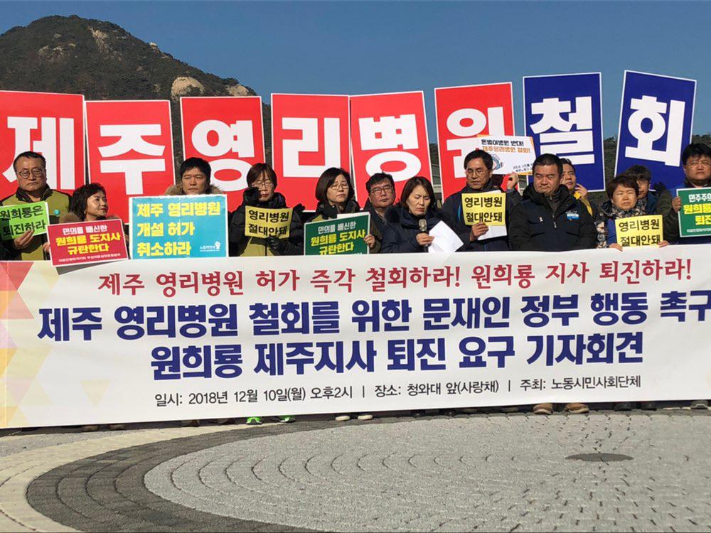 우리는 원희룡 도지사의 반민주주의 폭거를 용납하고 방관하고 있는 문재인 대통령과 박능후 보건복지 장관에게 국내 첫 영리병원 설립허가를 막기 위한 말뿐이 아닌 실질적인 조치를 취할 것을 요구한다.
