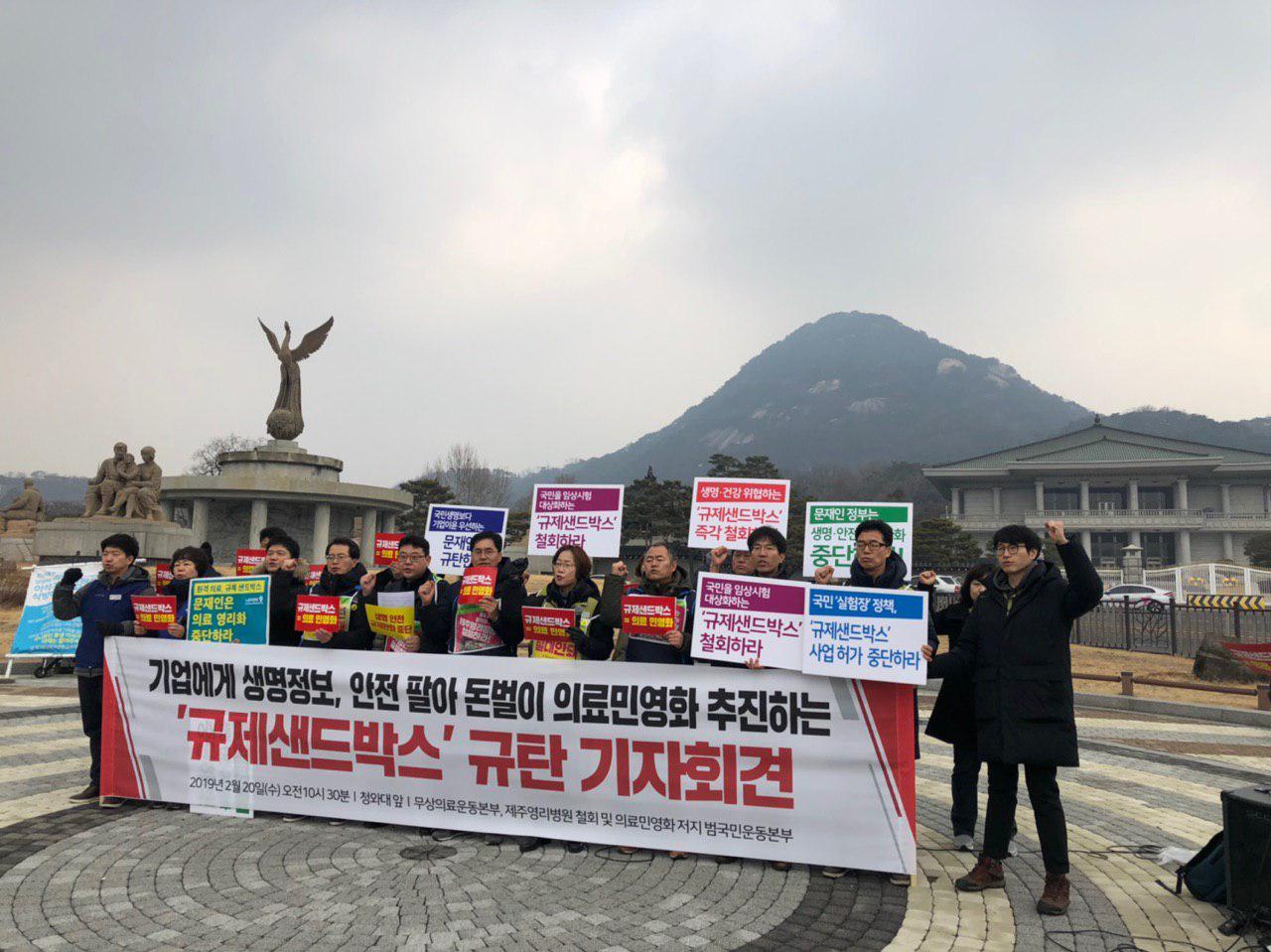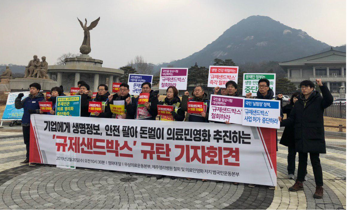 우리는 오늘 국민들의 촛불투쟁으로 당선되었다고 주장하는 정부가 국민 건강을 기업의 먹잇감으로 던져주고 있는 현실 앞에 참담함으로 이 자리에 섰다. 문재인 정부는 취임 초 ‘문재인케어’를 필두로 공공의료를 강화하고 국민건강과 의료 복지 향상에 기여하겠다고 밝혀왔다. 하지만 작년부터 기업들의 각종 규제완화 압력에 굴복해 체외진단기기 평가 간소화, 병원기술지주회사 허용, 보건의료빅데이터 상업화 등을 추진하였으며, 작년 9월에는 집권여당인 민주당이 앞장서 박근혜 정부 적폐인 규제프리존법을 포함한 이른바 규제샌드박스(규제프리존법, 산업융합촉진법, 정보통신융합법 등 이른바 규제혁신 5법중 3법)법을 통과시켰다.