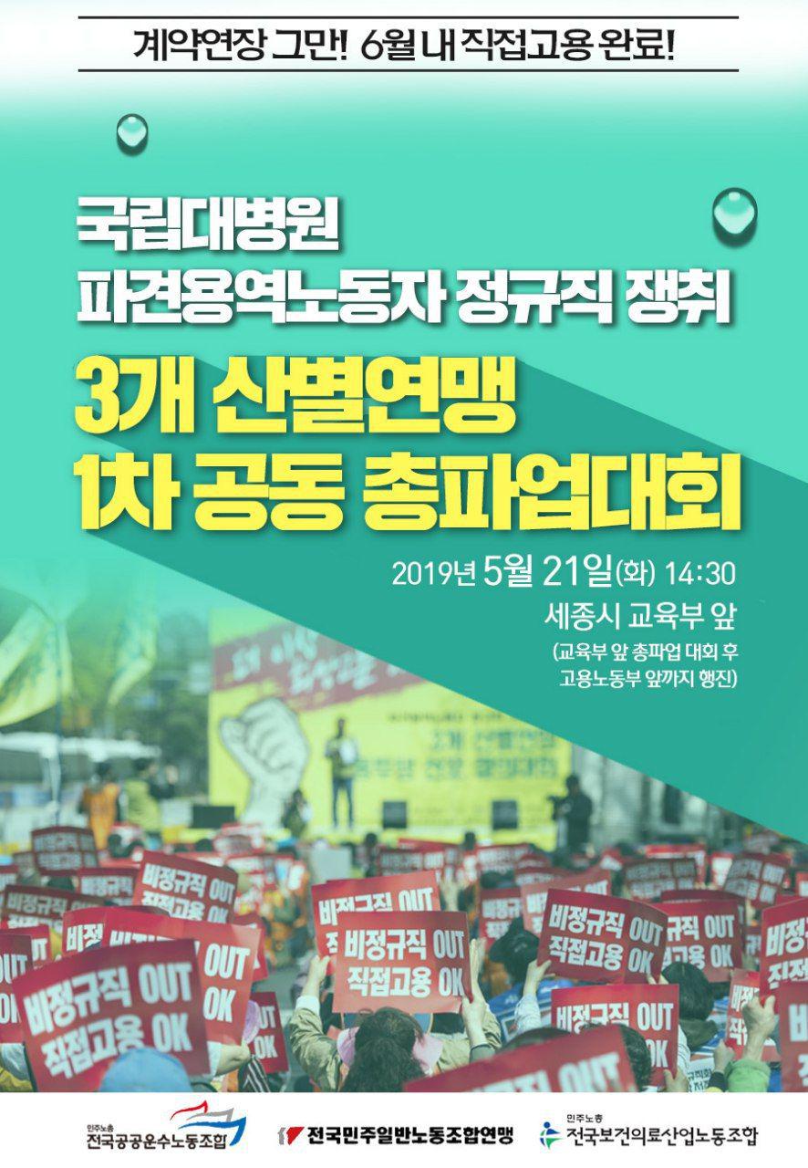 국립대병원 파견용역 노동자들이 정규직화 약속을 지킬 것을 요구하며 투쟁에 나선 것은 전적으로 정당하다. 6월에 계약이 만료되면 또다시 계약을 하고 파견용역 노동자로 일해야 하기 때문에, 6월 말 이전에 모든 국립대병원 파견용역 노동자들의 직접고용 정규직화를 요구하고 있다. 5월 21일 하루 파업은 정부에 대한 강력한 경고다.