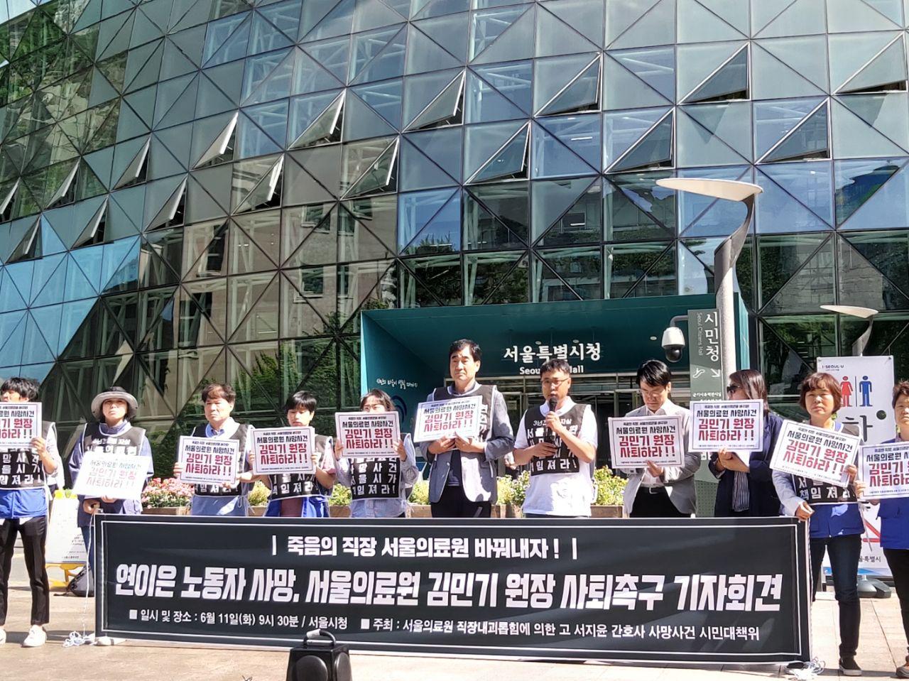 우리는 두 노동자들의 죽음으로 증언한 서울의료원의 현재를 반드시 바꿔낼 것이다. 한 노동자가 아픈 몸을 이끌고 12일을 연속근무해야 했던 병원, 고통을 견디지 못하고 목숨을 잃을 정도가 되어서야 겨우 조퇴를 할 수 있었던, 사람을 치료한다는 병원, 이제 서울의료원은 사람을 죽이는 병원이 아니라 사람을 살리는 제대로 된 병원으로 바뀌어야 한다. 사람을 살리는 병원으로 거듭나는 서울의료원의 출발은 이 모든 악행의 책임자 김민기 원장의 사퇴가 우선이다. 병원 노동자를 죽음으로 내모는 김민기 서울의료원장은 사퇴하라. 두 노동자의 죽음에 대한 진상을 규명하라. (끝)