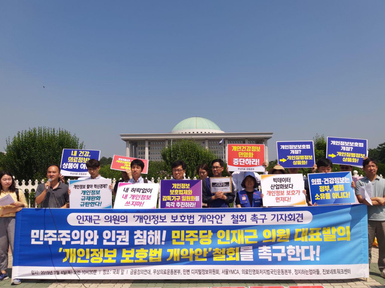 우리는 개인정보 규제 완화를 대표 발의한 인재근 의원에게 묻는다. 민주주의와 인권의 이름으로 국회의원이 되었다 해도 과언이 아닌 의원이, 오롯이 한국 민주주의와 인권의 역사가 담긴 개인정보 보호법의 근간을 허무는 법안을 대표발의한 것은 대단히 실망스러운 일이다. 우리는 한국 민주주의 투쟁의 역사와 궤를 같이 한 개인정보 보호법의 원칙을 훼손시키는 개정안을 철회할 것을 요구한다. 인재근 의원은 민주주의와 인권을 침해하는 개인정보 보호법 개정안을 당장 철회하라. 20대 국회는 결코 이러한 법안을 통과시켜선 안된다, 국민의 의료기록과 건강정보를 기업들의 이윤으로 넘겨주는 이 법을 지지하는 이들을 우리는 다가오는 총선에서 그 댓가를 치르게 될 것이라는 점을 분명히 밝힌다.