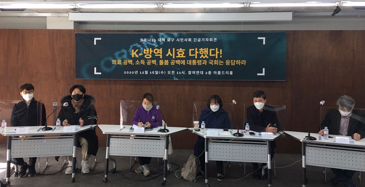 우리는 요구한다. 우선 재난지원금은 코로나19로 소득이 감소한 사람 모두에게 시급하고 충분하게 지급되어야 한다. 3조 원 규모로는 어림도 없다. 당장 희망 없이 살 길 막막한 서민들을 살려야 한다. 해고를 금지해 고용조건이 취약한 노동자들을 보호해야 한다. 재난 시기 임대료는 감면하거나 면제해야 한다. 금융기관의 이자징수도 일시 중지해야 한다. 방역에 대한 고통분담은 정부와 임대인, 금융기관이 함께 하는 것이 마땅하다. 돌봄 지원을 강화하고, 대면접촉이 불가피한 돌봄 인력을 대폭 충원해 노동량을 줄여야 한다. 아프면 쉴 수 있게 유급병가와 상병수당도 시급히 도입해야 한다. 한국은 국가가 활용할 수 있는 병상이 부족해 환자의 소폭 증가로도 거리두기 단계를 급격히 높일 수밖에 없고 이는 시민 개개인의 방역희생전가로 이어지고 있다. 당장은 민간병상을 동원해 치료대응역량을 높이는 것이 시급하다. 아울러 더 미루지 말고 공공의료기관 대폭 확충에 정부와 국회가 적극 나설 것을 촉구한다.