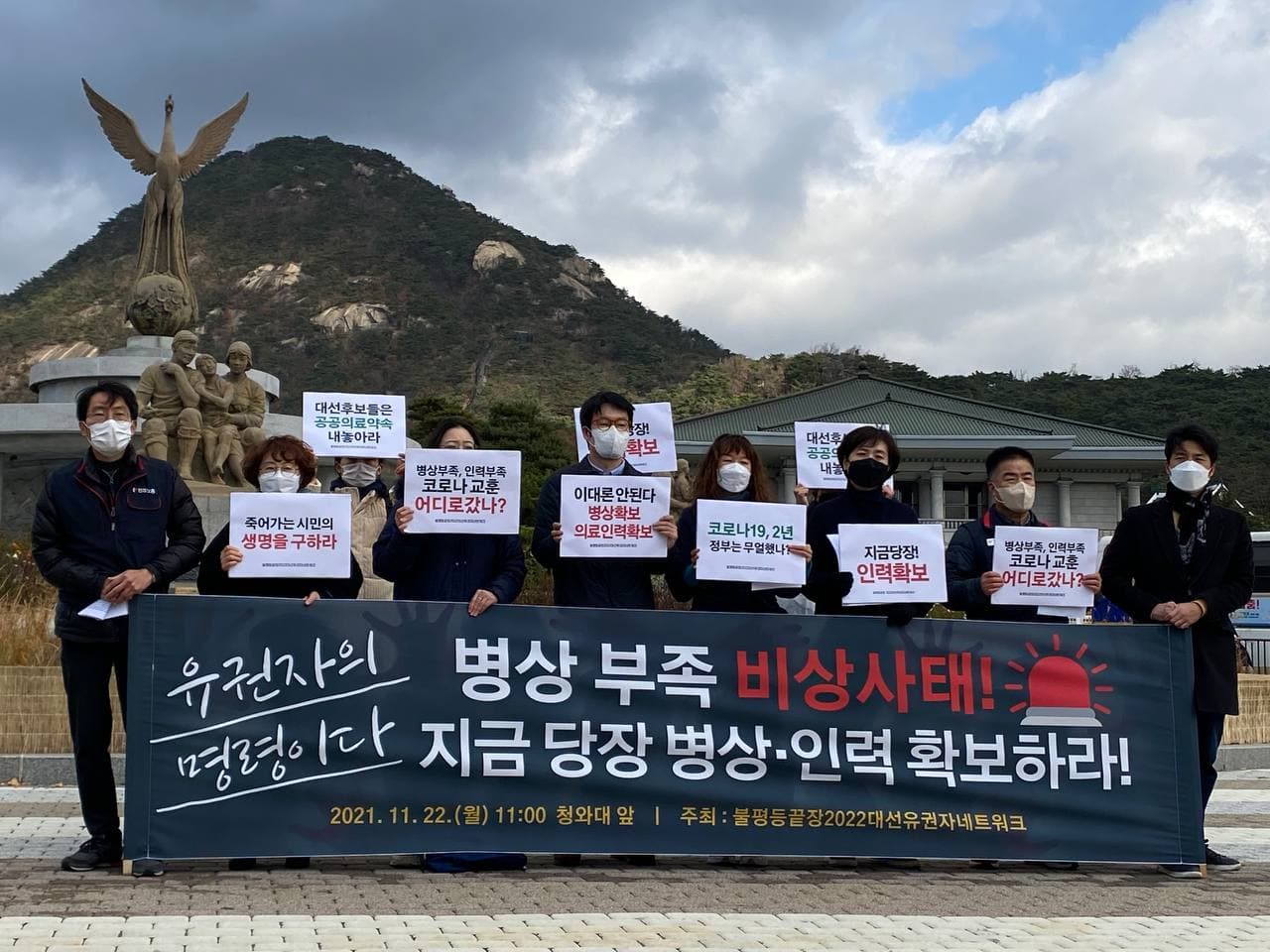우리는 정부와 국회, 대선후보자들에게 요구한다. 지금 당장 병상과 인력을 확보해 시민의 생명을 구하라. 지속가능한 방역을 위해 적극적인 재정 정책과 사회 정책을 추진할 것을 강력히 촉구한다.