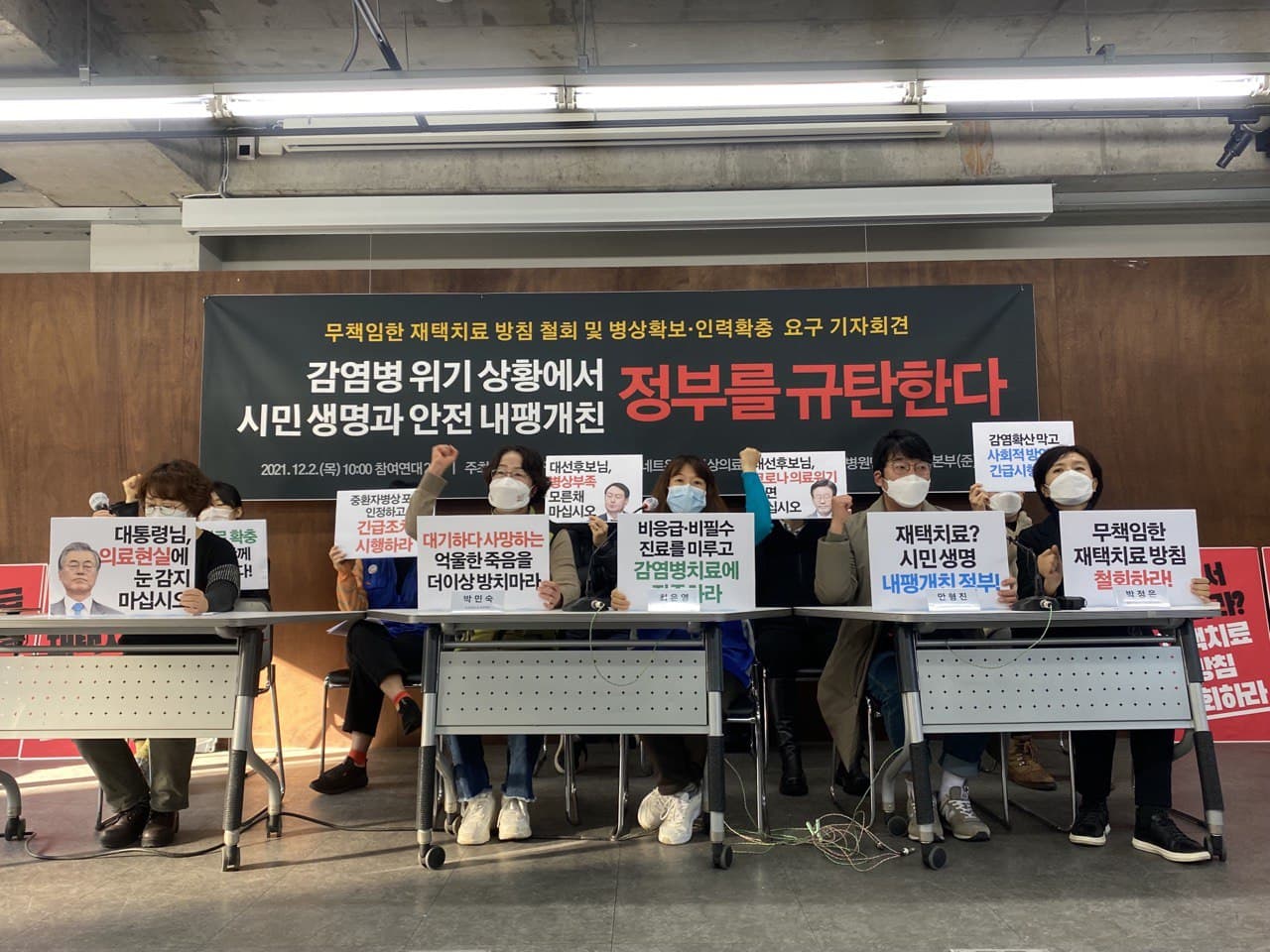 그러나 정부가 11/29 발표한 ‘코로나19 단계적 일상회복에 따른 의료 및 방역 후속대응계획’을 보면, 긴급한 현재의 상황에서 감염 확산을 막아 위기를 멈출 방법도, 민간의 중환자 병상과 의료 인력을 동원할 강한 의지도 찾아볼 수 없습니다. 정부는 재택치료 위주의 의료체계 전환을 앞세워 이야기하고 있습니다. 하지만 정부가 말하는 재택치료는 ‘치료’가 아니라 ‘방치’에 불과합니다. 무분별한 재택치료 확대는 중환자와 사망자를 늘릴 수밖에 없습니다.