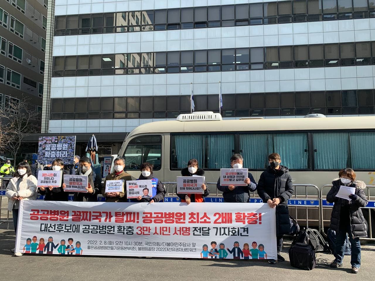 실제 우리나라의 공공의료기관 수와 함께 병상 비율은 OECD 가입국 중 최하위다. 공공병원의 부족은 감염병 사태에서 적절한 대응을 이끌어내지 못하며 희생자를 야기했다. 2020년 대구에서는 급작스럽게 발생한 코로나 중증환자 병상 부족으로 병상을 배정받지 못하는 환자가 자택에서 숨지는 일이 발생했고, 코로나19 3차 대유행 때는 병상배정을 기다리던 8명의 환자가 재택에서 사망하는 사례가 발생하기도 했다. 아울러 공공병원이 코로나 전담병원으로 전환되면서, 평소 공공병원에서 치료를 받던 저소득층이나 홈리스, 성폭력 피해자, 이주민, HIV 감염 환자 등 특히, 급여환자들은 상대적으로 비싼 종합병원을 이용하게 되었다. 이처럼 의료사각지대가 넓어지고 있는 현실을 개선하고, 국민의 건강권 확보를 위해 공공병원 설립 만이 해결법이다. 코로나19와 같은 감염병 발생이 빈번해질 것이라는 보건전문가의 예측이 이어지는 만큼 공공병원 최소 2배 이상 확충하여 공공의료 중심의 의료전달체계를 구축하고, 우리나라 어디에서나 국민이 필수 의료서비스를 공급받을 수 있도록 하루빨리 공공병원을 전국에 확충해야 한다. 여당과 야당 대선후보자는 3만 명 시민의 서명과 노동시민단체의 요구를 받아들여 공공병원 확충을 조속히 추진하라.