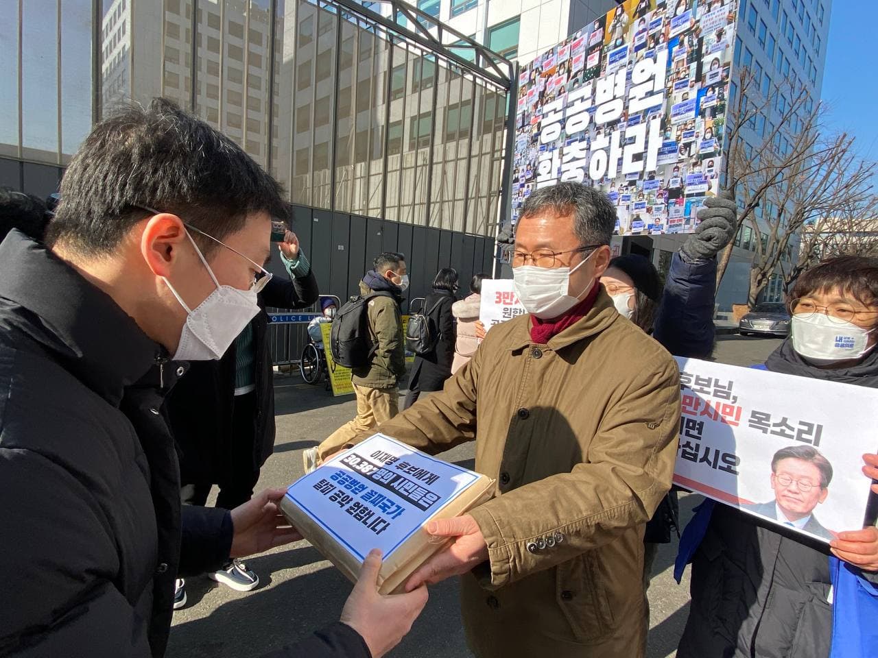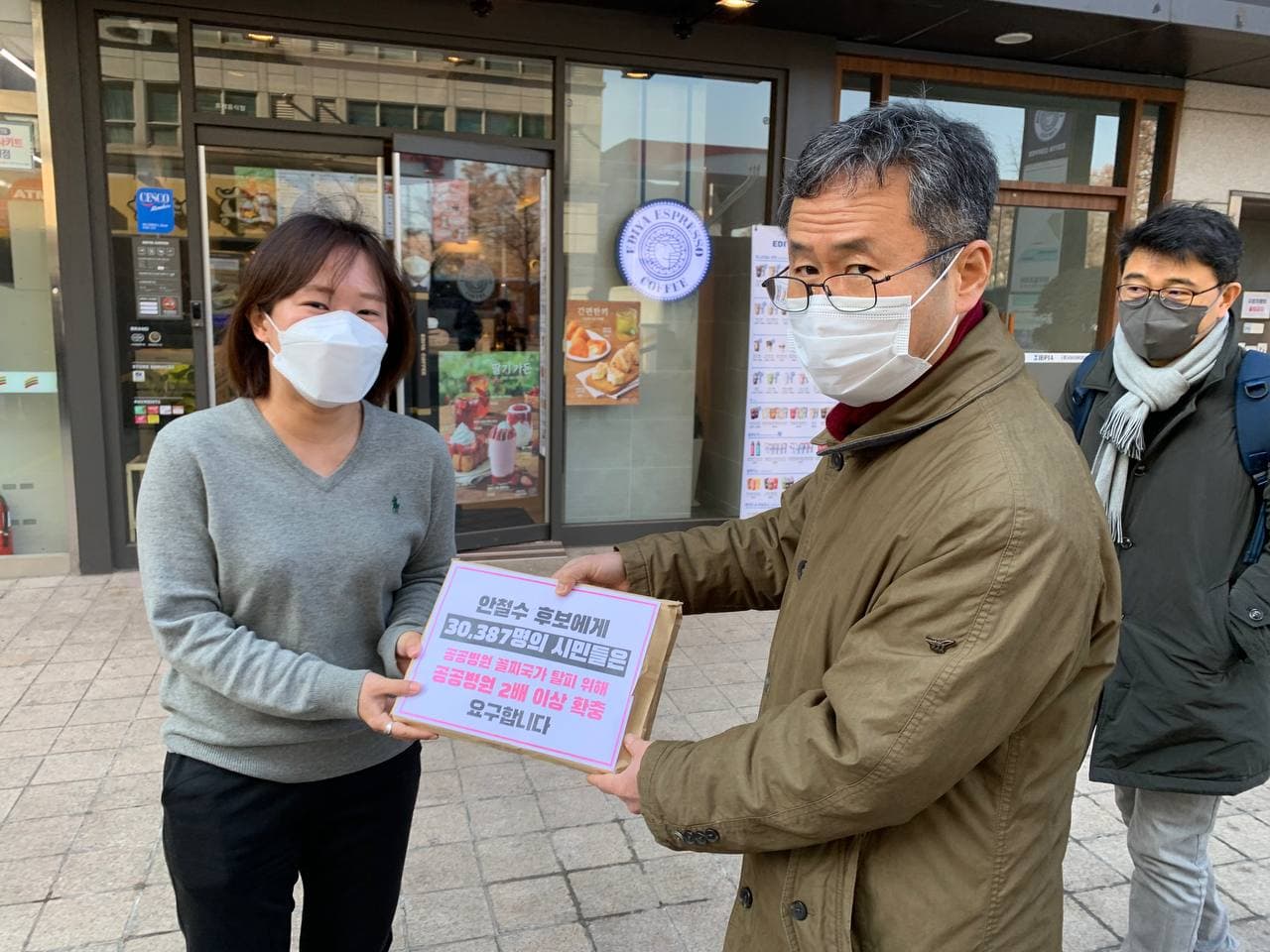 이런 뜻을 모아 오늘 공공병원의 확충을 바라는 3만 명의 시민 서명을 받아 대통령 후보에게 전달한다. 짧은 시간 동안 달성한 3만 명의 서명에는 공공의료 강화와 생명 안전을 요구하는 수많은 사람들의 뜻이 담겨 있다는 점을 명심해야 한다. 공공병원 확충과 강화는 모두의 요구이고 시대적 소명이다. 이를 결코 가볍게 여겨서는 안된다. 이번 코로나19는 어쩌면 앞으로 다가올 더 큰 인류의 재난을 예고하는 것일 수 있음을 명심하라. 각 정당의 후보들은 국민들의 생명을 살리기 위해 책임 있는 약속을 내놓아야 한다.