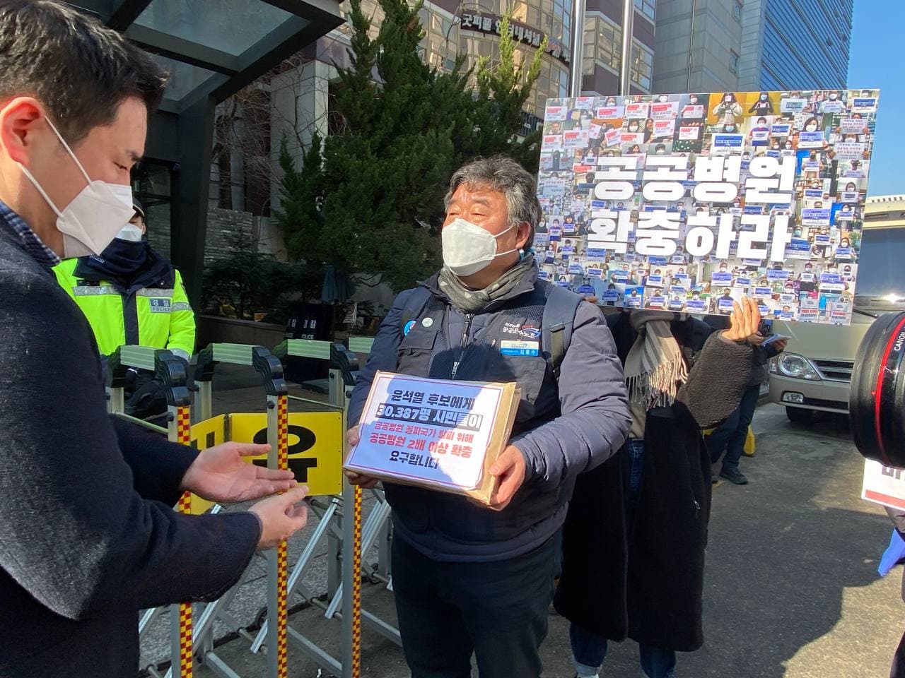 국민의 힘 윤석열 후보는 공공의료 확충에 전혀 관심이 없고 오히려 민간병원을 비호하고 의료영리화를 추진하는 데에만 관심을 보이고 있다. 우리는 시민의 생명을 내팽개치려 하는 국민의힘 윤석열 후보를 수만명의 서명자들과 함께 질책하고 최소한의 행동을 촉구하고자 한다. 먼저 윤석열 후보는 코로나19 시기 공공의료 확충 약속이 전무하다. 윤석열 후보가 약속한 것이라고는민간의료기관에 인센티브를 주겠다는 것 뿐이다.